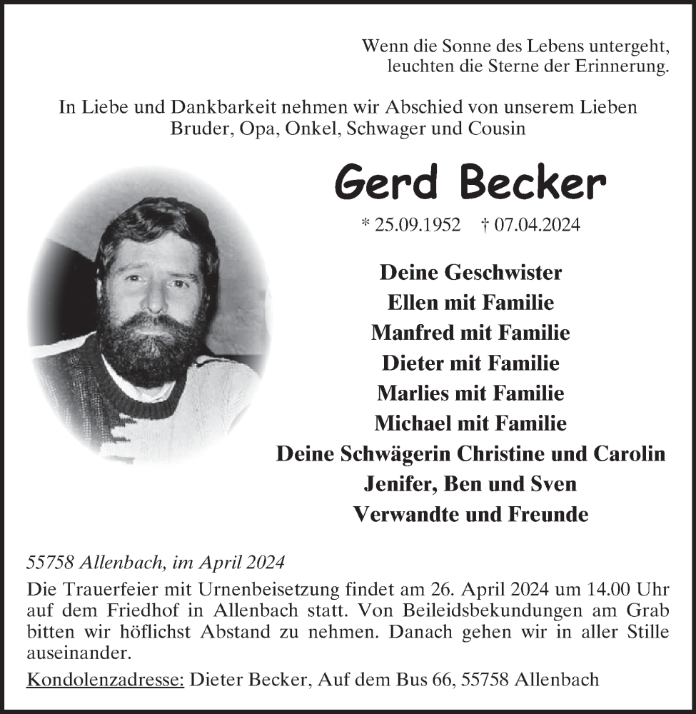 Hier finden Sie alle Traueranzeigen aus der Zeitung, die bisher für Gerd Becker erschienen sind. Weitere Traueranzeigen, die in der Zeitung erscheinen, werden hier ebenfalls aufgelistet