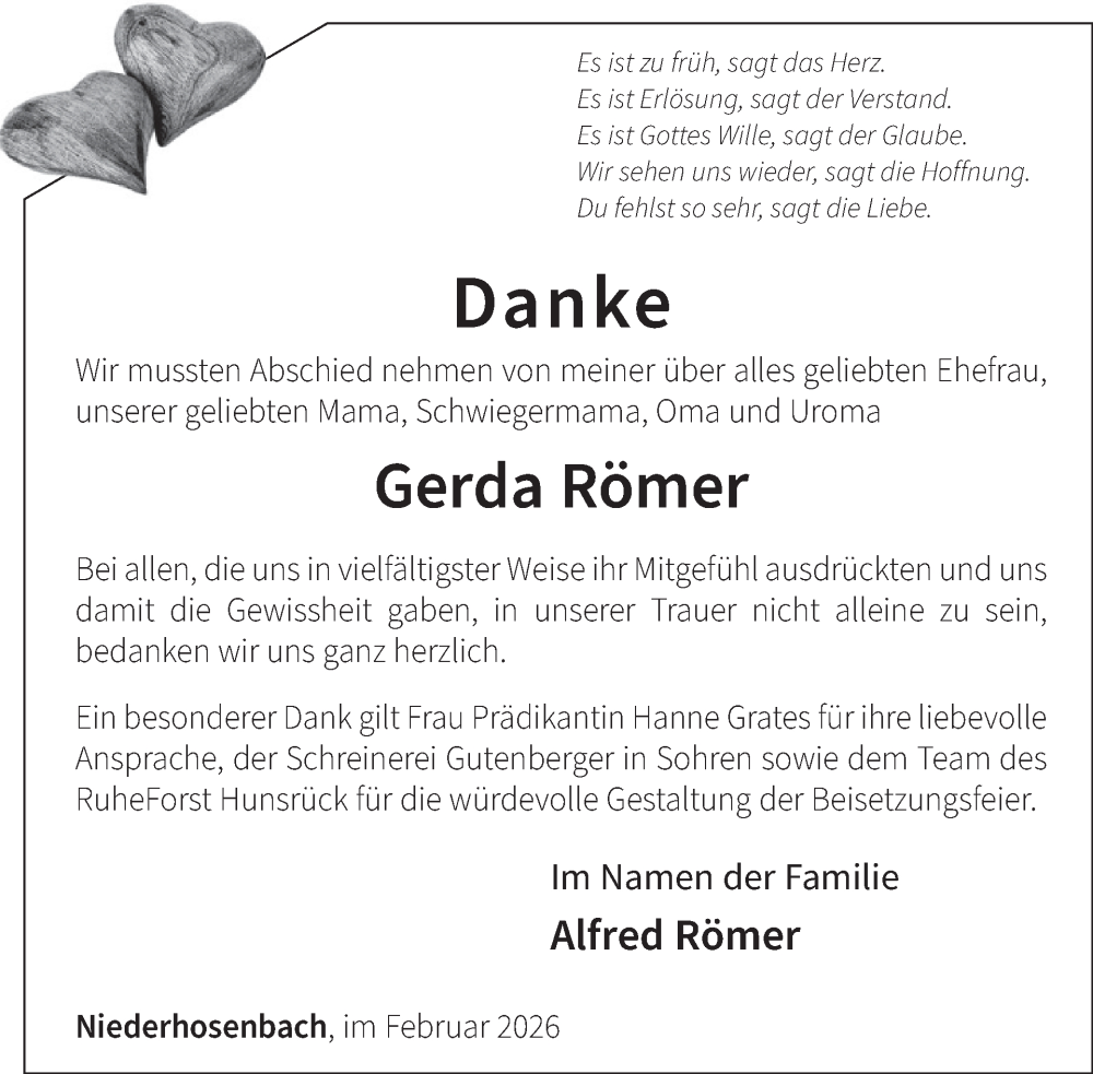 Hier finden Sie alle Traueranzeigen aus der Zeitung, die bisher für Gerda Römer erschienen sind. Weitere Traueranzeigen, die in der Zeitung erscheinen, werden hier ebenfalls aufgelistet