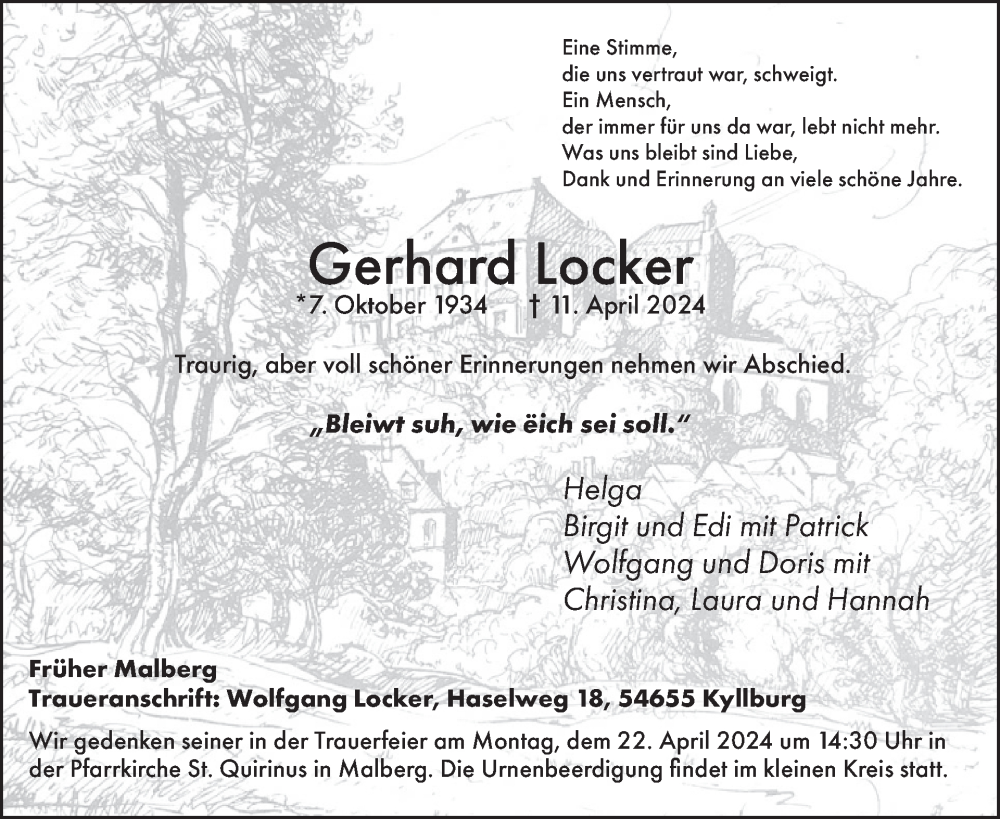 Hier finden Sie alle Traueranzeigen aus der Zeitung, die bisher für Gerhard Locker erschienen sind. Weitere Traueranzeigen, die in der Zeitung erscheinen, werden hier ebenfalls aufgelistet