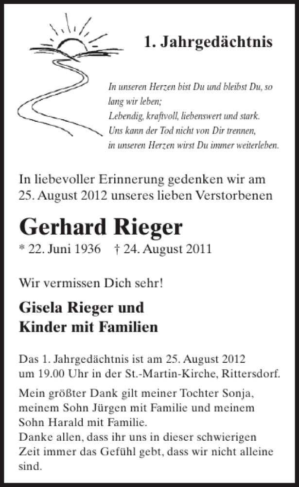 Hier finden Sie alle Traueranzeigen aus der Zeitung, die bisher für Gerhard Rieger erschienen sind. Weitere Traueranzeigen, die in der Zeitung erscheinen, werden hier ebenfalls aufgelistet