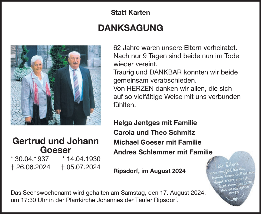 Hier finden Sie alle Traueranzeigen aus der Zeitung, die bisher für Gertrud Goeser erschienen sind. Weitere Traueranzeigen, die in der Zeitung erscheinen, werden hier ebenfalls aufgelistet