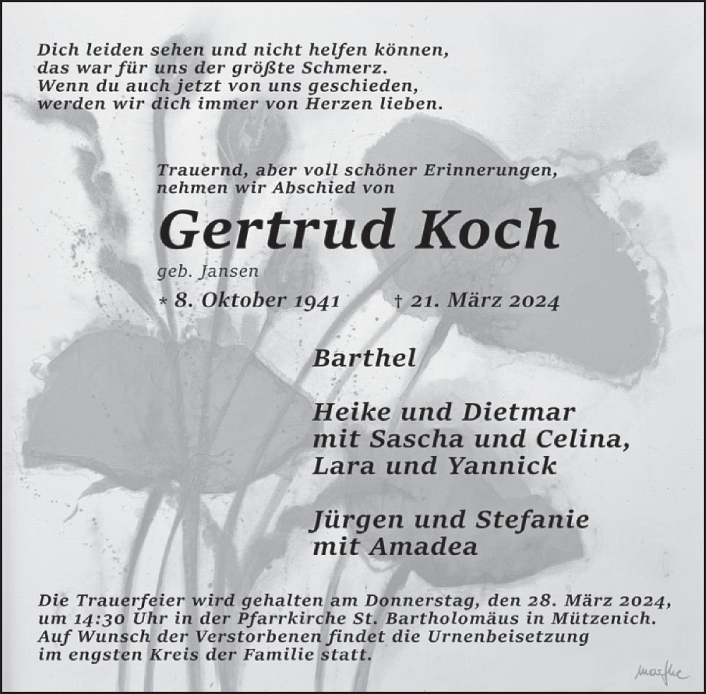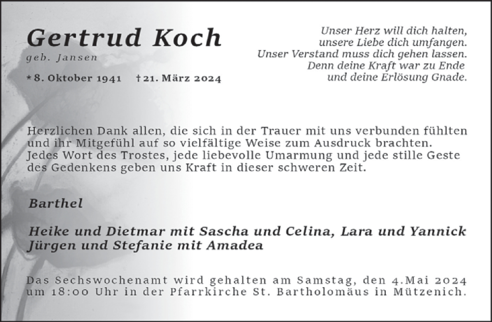 Hier finden Sie alle Traueranzeigen aus der Zeitung, die bisher für Gertrud Koch erschienen sind. Weitere Traueranzeigen, die in der Zeitung erscheinen, werden hier ebenfalls aufgelistet