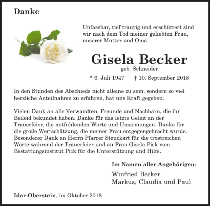 Hier finden Sie alle Traueranzeigen aus der Zeitung, die bisher für Gisela Becker erschienen sind. Weitere Traueranzeigen, die in der Zeitung erscheinen, werden hier ebenfalls aufgelistet