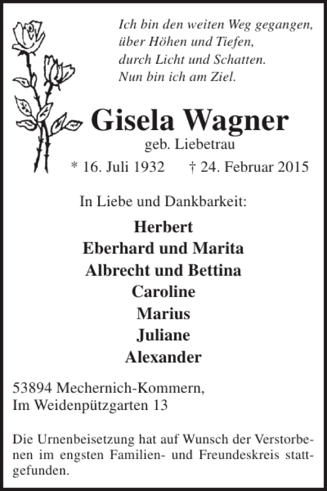 Hier finden Sie alle Traueranzeigen aus der Zeitung, die bisher für Gisela Wagner erschienen sind. Weitere Traueranzeigen, die in der Zeitung erscheinen, werden hier ebenfalls aufgelistet