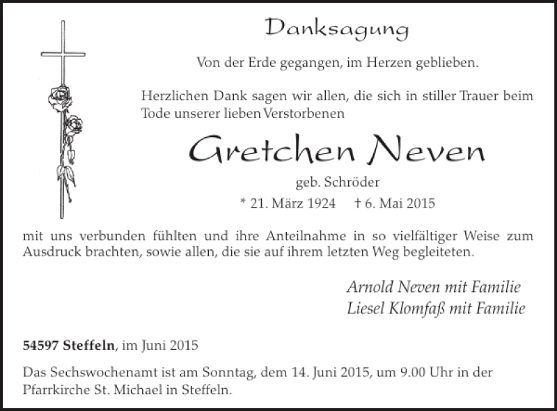 Hier finden Sie alle Traueranzeigen aus der Zeitung, die bisher für Gretchen Neven erschienen sind. Weitere Traueranzeigen, die in der Zeitung erscheinen, werden hier ebenfalls aufgelistet