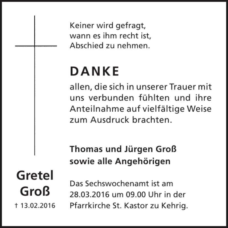 Hier finden Sie alle Traueranzeigen aus der Zeitung, die bisher für Gretel Groß erschienen sind. Weitere Traueranzeigen, die in der Zeitung erscheinen, werden hier ebenfalls aufgelistet