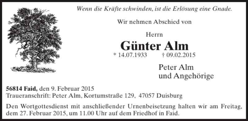 Hier finden Sie alle Traueranzeigen aus der Zeitung, die bisher für Günter Alm erschienen sind. Weitere Traueranzeigen, die in der Zeitung erscheinen, werden hier ebenfalls aufgelistet