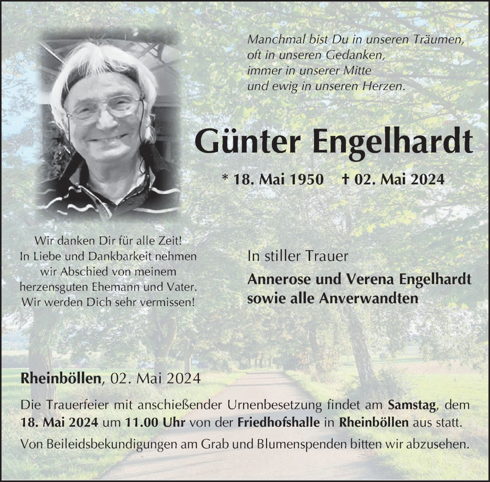 Hier finden Sie alle Traueranzeigen aus der Zeitung, die bisher für Günter Engelhardt erschienen sind. Weitere Traueranzeigen, die in der Zeitung erscheinen, werden hier ebenfalls aufgelistet