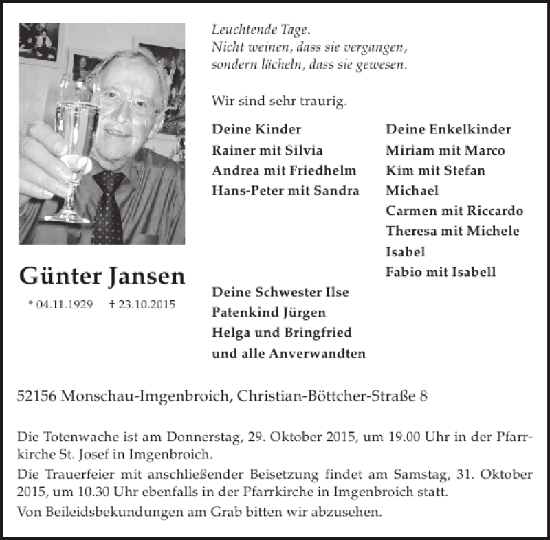 Hier finden Sie alle Traueranzeigen aus der Zeitung, die bisher für Günter Jansen erschienen sind. Weitere Traueranzeigen, die in der Zeitung erscheinen, werden hier ebenfalls aufgelistet