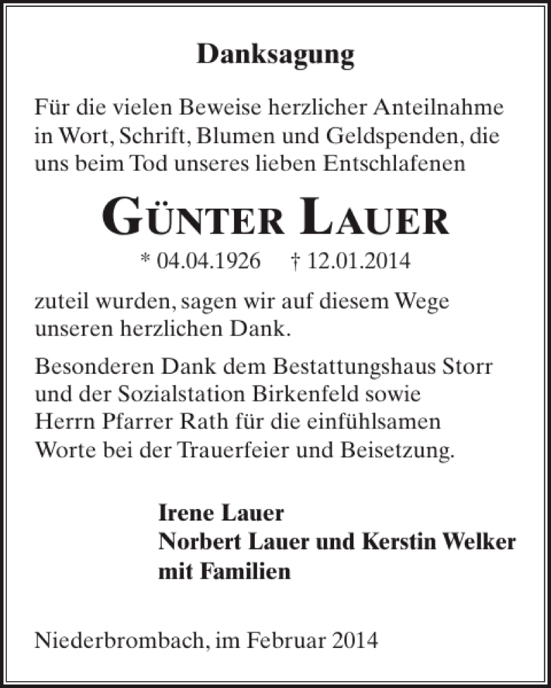 Hier finden Sie alle Traueranzeigen aus der Zeitung, die bisher für Günter Lauer erschienen sind. Weitere Traueranzeigen, die in der Zeitung erscheinen, werden hier ebenfalls aufgelistet