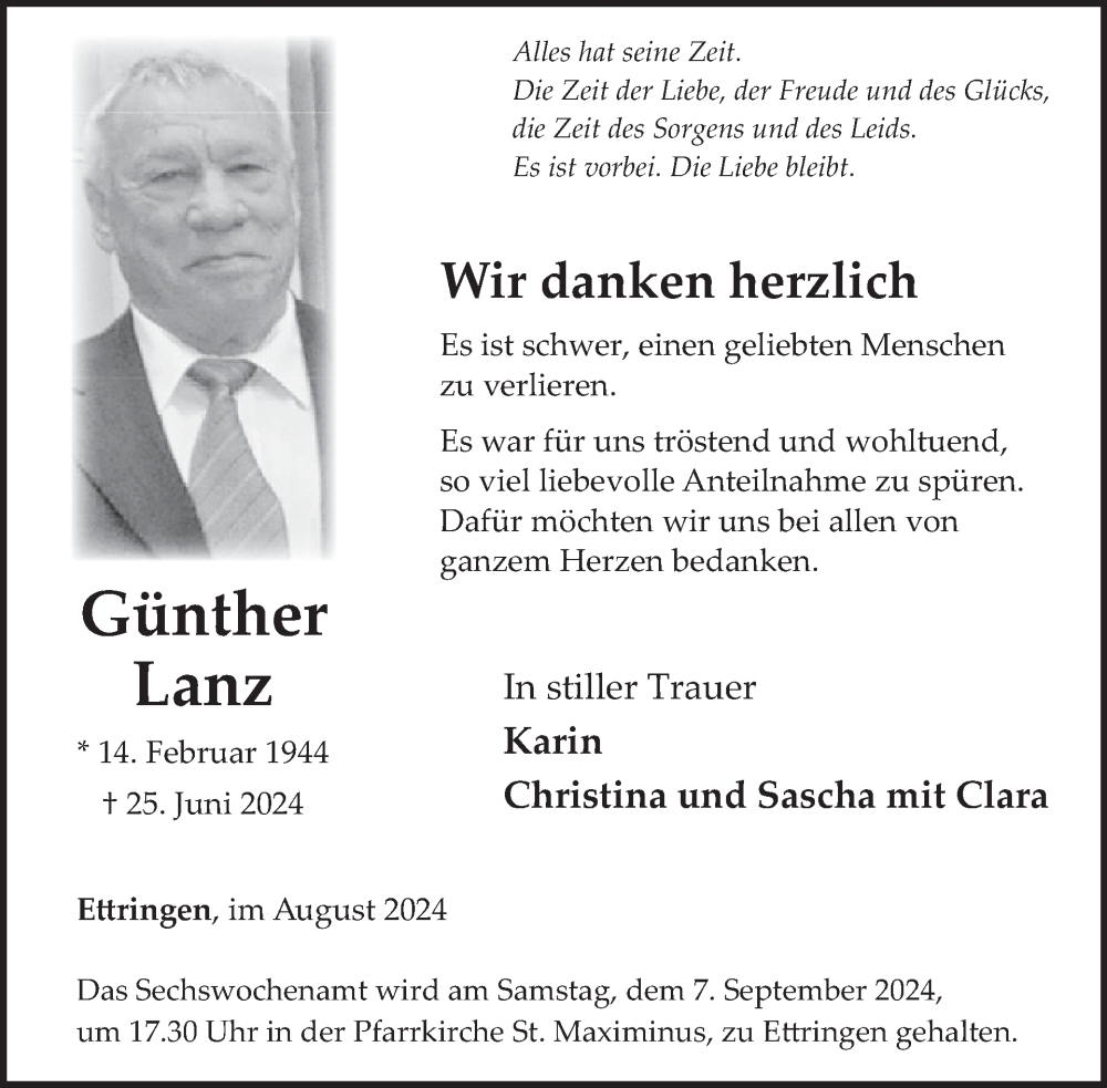 Hier finden Sie alle Traueranzeigen aus der Zeitung, die bisher für Günther Lanz erschienen sind. Weitere Traueranzeigen, die in der Zeitung erscheinen, werden hier ebenfalls aufgelistet