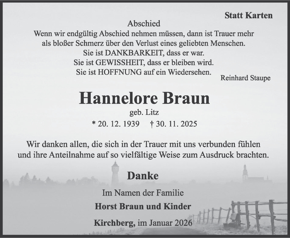 Hier finden Sie alle Traueranzeigen aus der Zeitung, die bisher für Hannelore Braun erschienen sind. Weitere Traueranzeigen, die in der Zeitung erscheinen, werden hier ebenfalls aufgelistet