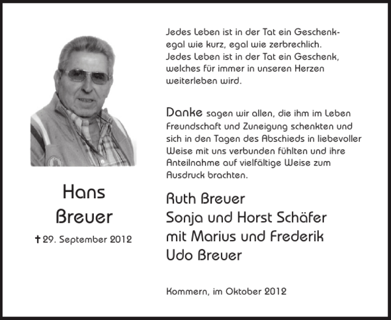 Hier finden Sie alle Traueranzeigen aus der Zeitung, die bisher für Hans Breuer erschienen sind. Weitere Traueranzeigen, die in der Zeitung erscheinen, werden hier ebenfalls aufgelistet