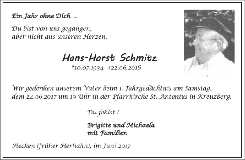 Hier finden Sie alle Traueranzeigen aus der Zeitung, die bisher für Hans-Horst Schmitz erschienen sind. Weitere Traueranzeigen, die in der Zeitung erscheinen, werden hier ebenfalls aufgelistet