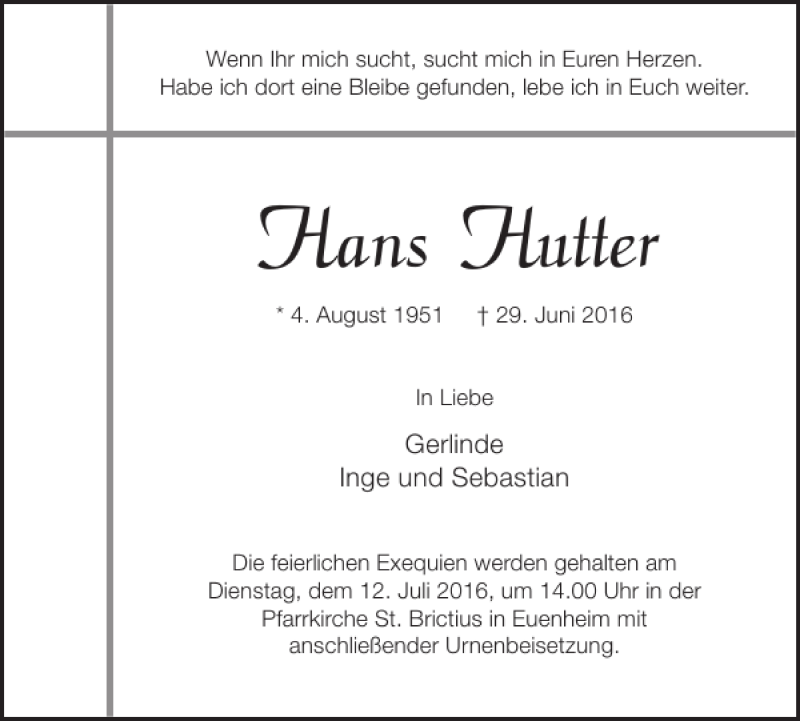 Hier finden Sie alle Traueranzeigen aus der Zeitung, die bisher für Hans Hutter erschienen sind. Weitere Traueranzeigen, die in der Zeitung erscheinen, werden hier ebenfalls aufgelistet