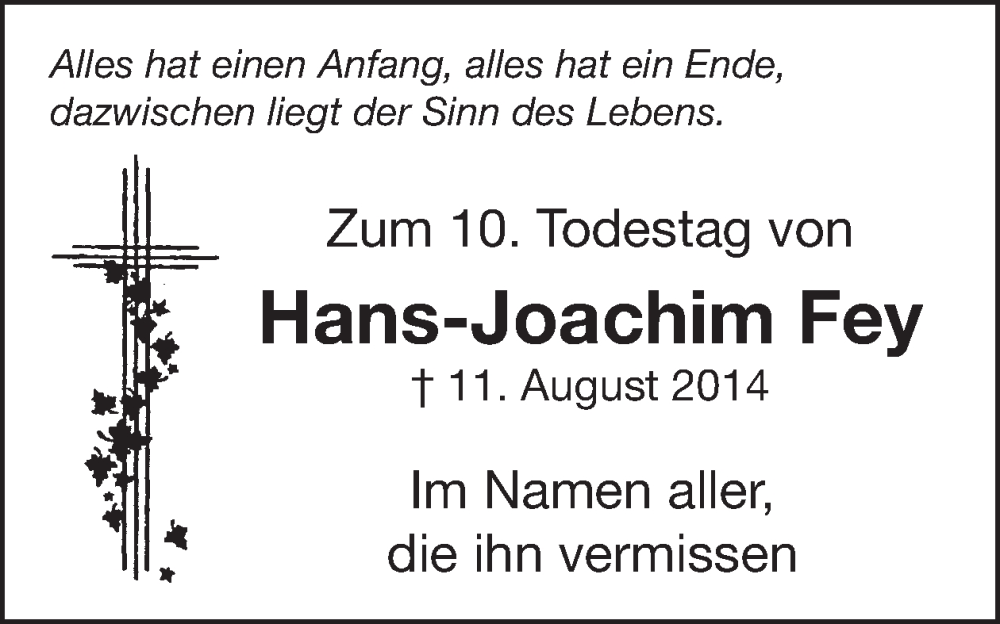 Hier finden Sie alle Traueranzeigen aus der Zeitung, die bisher für Hans-Joachim Fey erschienen sind. Weitere Traueranzeigen, die in der Zeitung erscheinen, werden hier ebenfalls aufgelistet