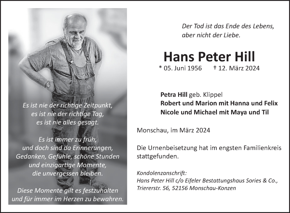 Hier finden Sie alle Traueranzeigen aus der Zeitung, die bisher für Hans Peter Hill erschienen sind. Weitere Traueranzeigen, die in der Zeitung erscheinen, werden hier ebenfalls aufgelistet