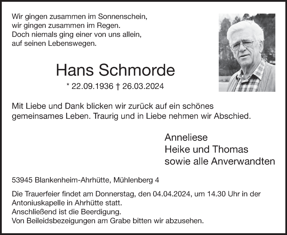 Hier finden Sie alle Traueranzeigen aus der Zeitung, die bisher für Hans Schmorde erschienen sind. Weitere Traueranzeigen, die in der Zeitung erscheinen, werden hier ebenfalls aufgelistet