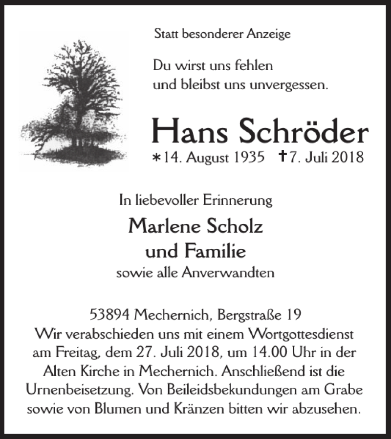 Hier finden Sie alle Traueranzeigen aus der Zeitung, die bisher für Hans Schröder erschienen sind. Weitere Traueranzeigen, die in der Zeitung erscheinen, werden hier ebenfalls aufgelistet