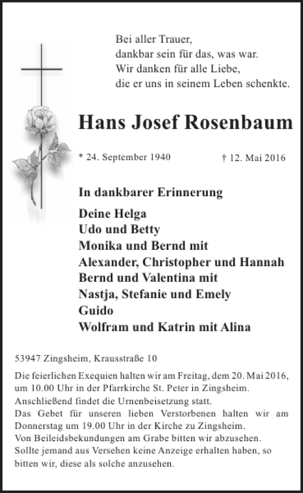 Hier finden Sie alle Traueranzeigen aus der Zeitung, die bisher für Hans Josef Rosenbaum erschienen sind. Weitere Traueranzeigen, die in der Zeitung erscheinen, werden hier ebenfalls aufgelistet