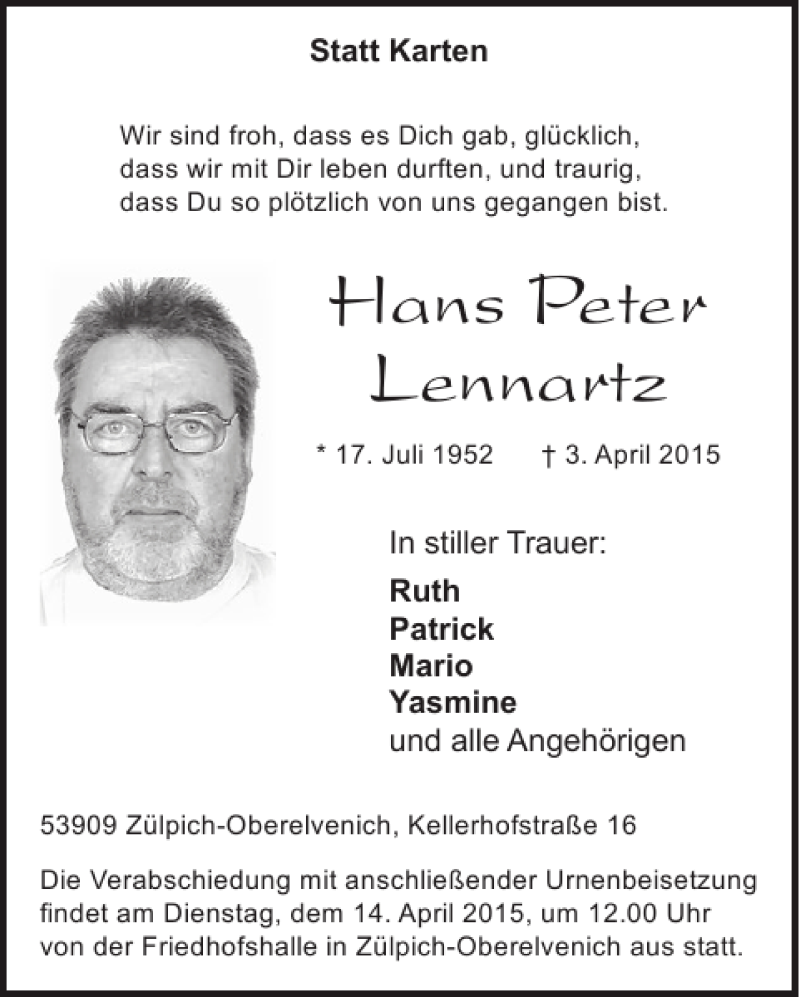 Hier finden Sie alle Traueranzeigen aus der Zeitung, die bisher für Hans Peter Lennartz erschienen sind. Weitere Traueranzeigen, die in der Zeitung erscheinen, werden hier ebenfalls aufgelistet