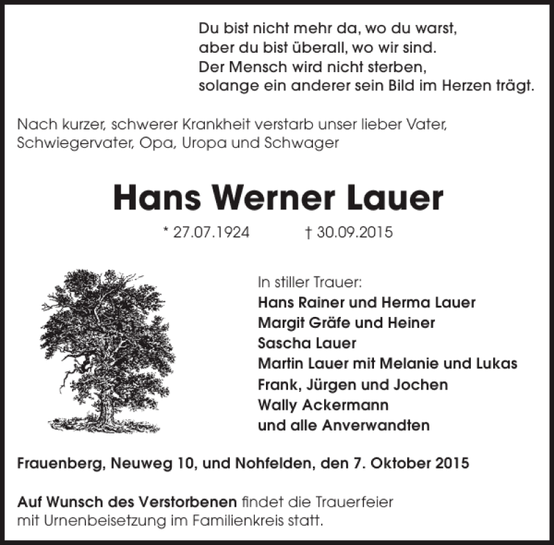Hier finden Sie alle Traueranzeigen aus der Zeitung, die bisher für Hans Werner Lauer erschienen sind. Weitere Traueranzeigen, die in der Zeitung erscheinen, werden hier ebenfalls aufgelistet