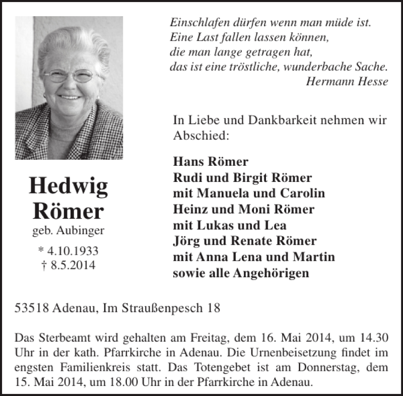 Hier finden Sie alle Traueranzeigen aus der Zeitung, die bisher für Hedwig Römer erschienen sind. Weitere Traueranzeigen, die in der Zeitung erscheinen, werden hier ebenfalls aufgelistet