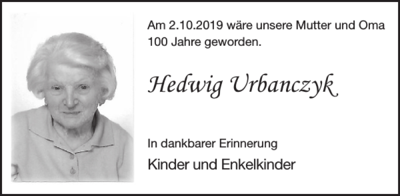 Hier finden Sie alle Traueranzeigen aus der Zeitung, die bisher für Hedwig Urbanczyk erschienen sind. Weitere Traueranzeigen, die in der Zeitung erscheinen, werden hier ebenfalls aufgelistet