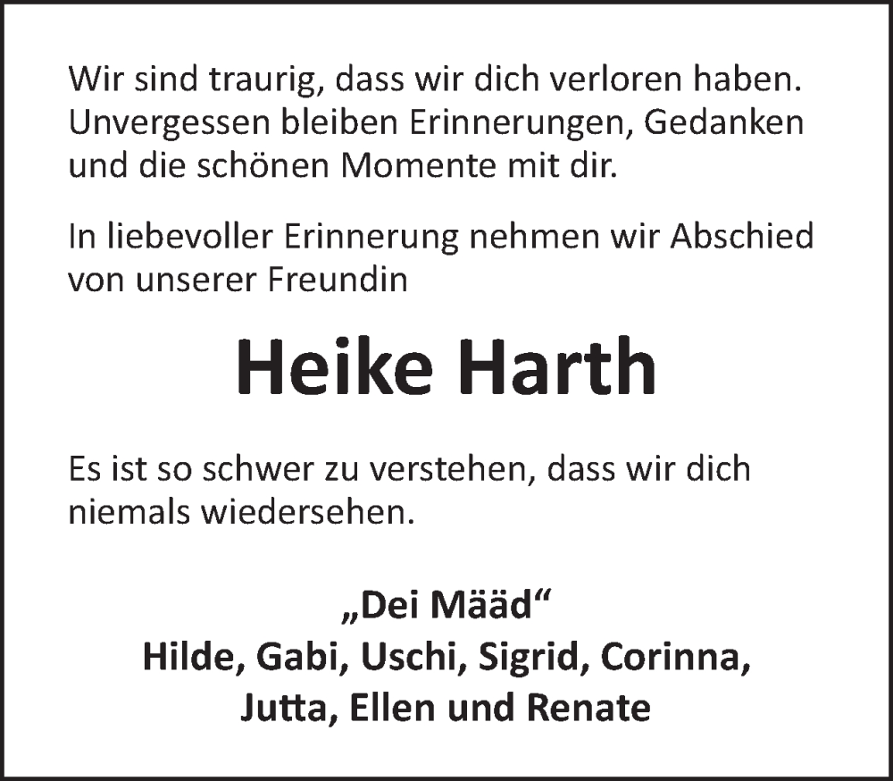 Hier finden Sie alle Traueranzeigen aus der Zeitung, die bisher für Heike Harth erschienen sind. Weitere Traueranzeigen, die in der Zeitung erscheinen, werden hier ebenfalls aufgelistet