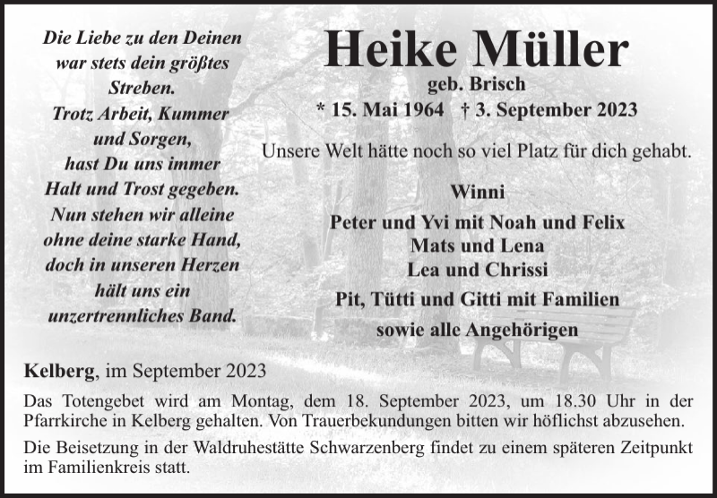 Hier finden Sie alle Traueranzeigen aus der Zeitung, die bisher für Heike Müller erschienen sind. Weitere Traueranzeigen, die in der Zeitung erscheinen, werden hier ebenfalls aufgelistet