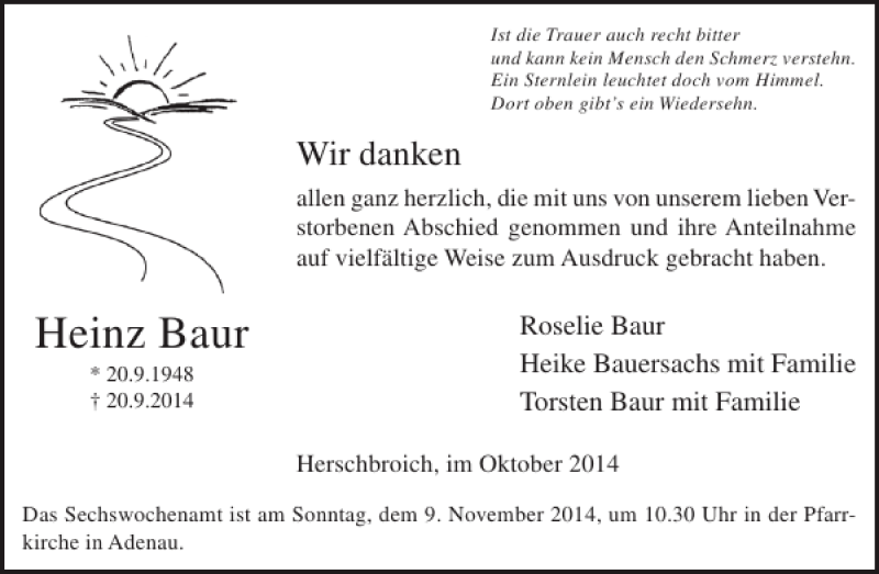 Hier finden Sie alle Traueranzeigen aus der Zeitung, die bisher für Heinz Baur erschienen sind. Weitere Traueranzeigen, die in der Zeitung erscheinen, werden hier ebenfalls aufgelistet