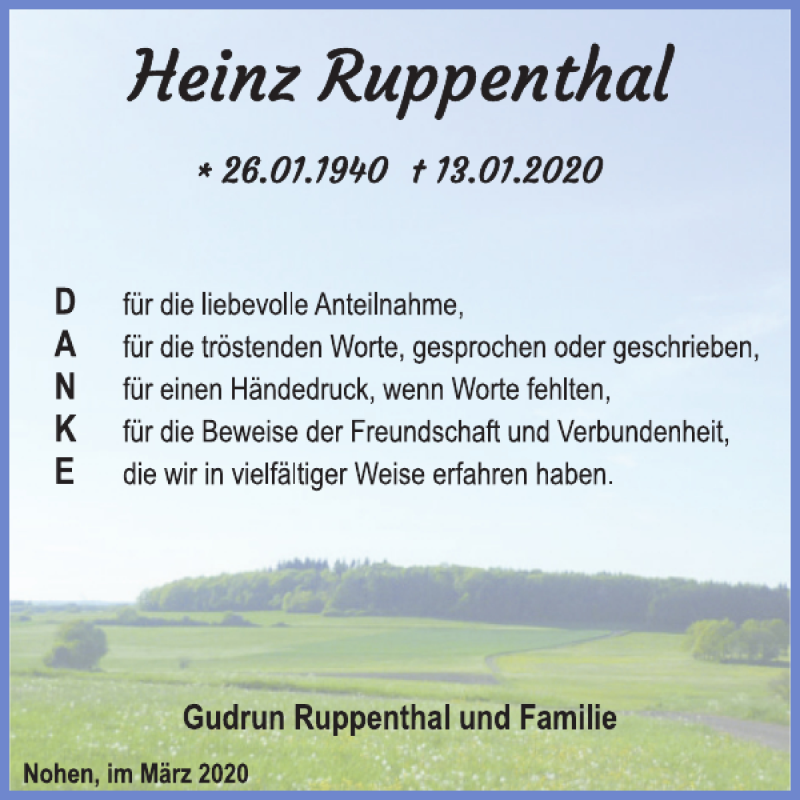 Hier finden Sie alle Traueranzeigen aus der Zeitung, die bisher für Heinz Ruppenthal erschienen sind. Weitere Traueranzeigen, die in der Zeitung erscheinen, werden hier ebenfalls aufgelistet
