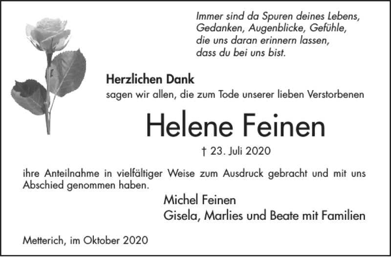 Hier finden Sie alle Traueranzeigen aus der Zeitung, die bisher für Helene Feinen erschienen sind. Weitere Traueranzeigen, die in der Zeitung erscheinen, werden hier ebenfalls aufgelistet