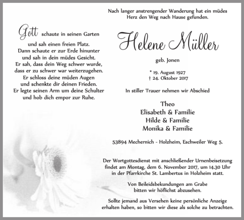 Hier finden Sie alle Traueranzeigen aus der Zeitung, die bisher für Helene Müller erschienen sind. Weitere Traueranzeigen, die in der Zeitung erscheinen, werden hier ebenfalls aufgelistet