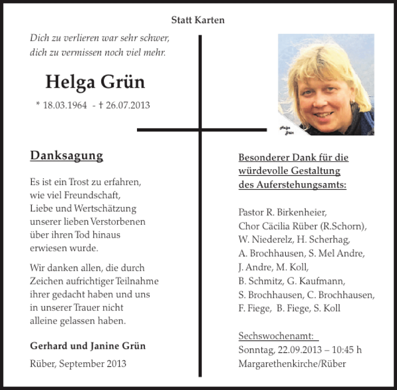 Hier finden Sie alle Traueranzeigen aus der Zeitung, die bisher für Helga Grün erschienen sind. Weitere Traueranzeigen, die in der Zeitung erscheinen, werden hier ebenfalls aufgelistet