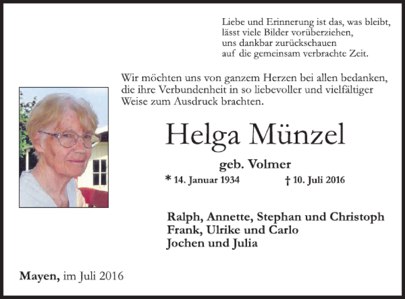 Hier finden Sie alle Traueranzeigen aus der Zeitung, die bisher für Helga Münzel erschienen sind. Weitere Traueranzeigen, die in der Zeitung erscheinen, werden hier ebenfalls aufgelistet