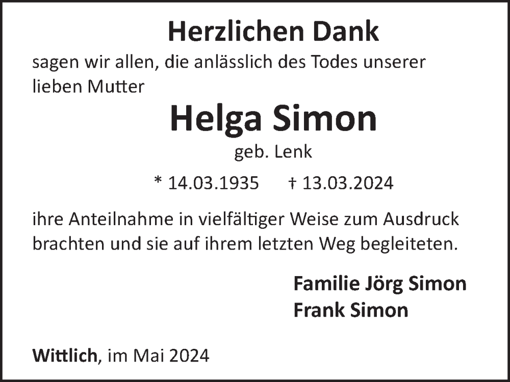 Hier finden Sie alle Traueranzeigen aus der Zeitung, die bisher für Helga Simon erschienen sind. Weitere Traueranzeigen, die in der Zeitung erscheinen, werden hier ebenfalls aufgelistet