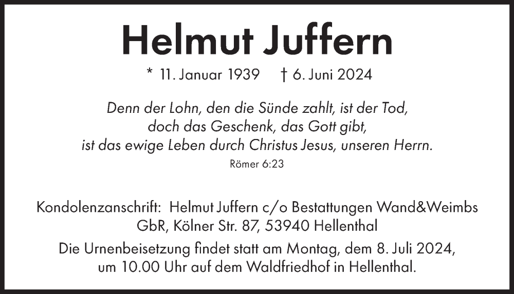 Hier finden Sie alle Traueranzeigen aus der Zeitung, die bisher für Helmut Juffern erschienen sind. Weitere Traueranzeigen, die in der Zeitung erscheinen, werden hier ebenfalls aufgelistet