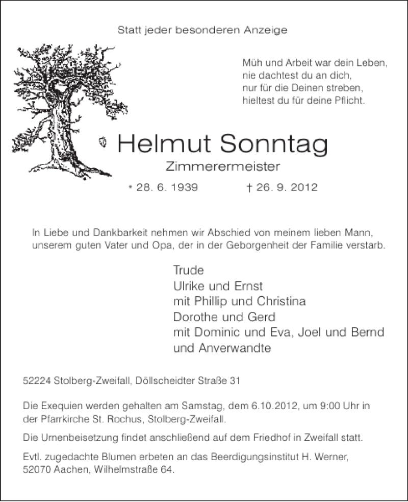 Hier finden Sie alle Traueranzeigen aus der Zeitung, die bisher für Helmut Sonntag erschienen sind. Weitere Traueranzeigen, die in der Zeitung erscheinen, werden hier ebenfalls aufgelistet