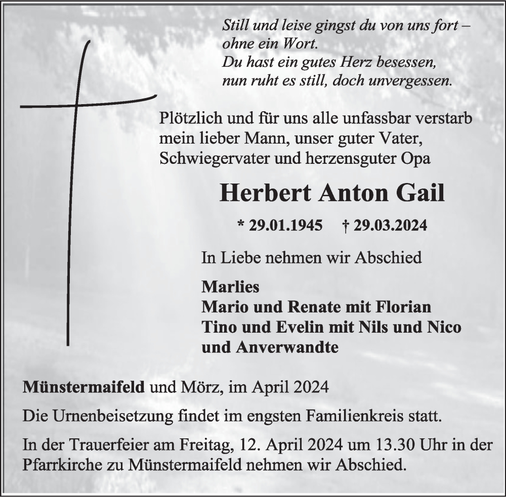 Hier finden Sie alle Traueranzeigen aus der Zeitung, die bisher für Herbert Anton Gail erschienen sind. Weitere Traueranzeigen, die in der Zeitung erscheinen, werden hier ebenfalls aufgelistet