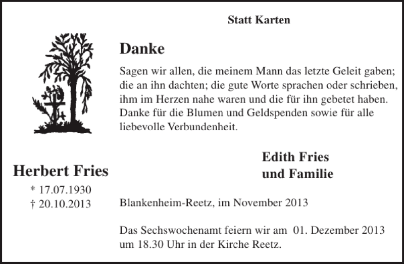Hier finden Sie alle Traueranzeigen aus der Zeitung, die bisher für Herbert Fries erschienen sind. Weitere Traueranzeigen, die in der Zeitung erscheinen, werden hier ebenfalls aufgelistet