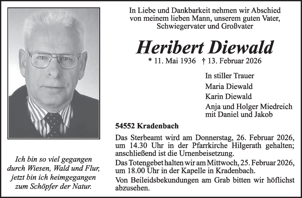 Hier finden Sie alle Traueranzeigen aus der Zeitung, die bisher für Heribert Diewald erschienen sind. Weitere Traueranzeigen, die in der Zeitung erscheinen, werden hier ebenfalls aufgelistet