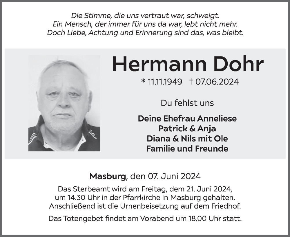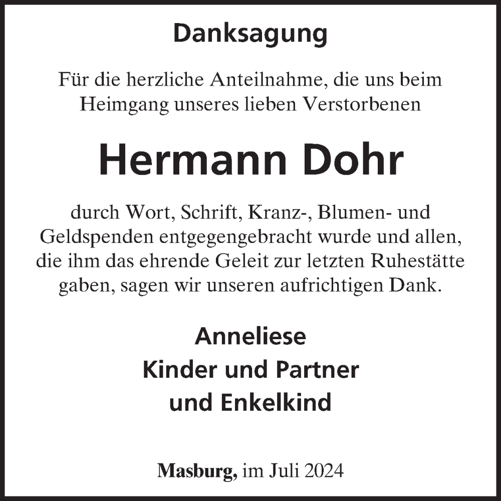 Hier finden Sie alle Traueranzeigen aus der Zeitung, die bisher für Hermann Dohr erschienen sind. Weitere Traueranzeigen, die in der Zeitung erscheinen, werden hier ebenfalls aufgelistet