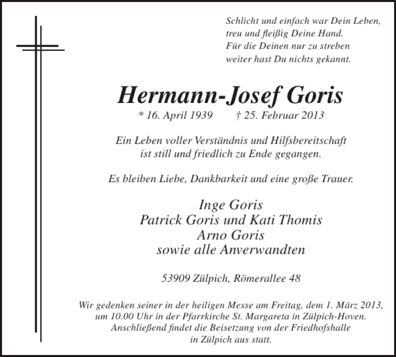 Hier finden Sie alle Traueranzeigen aus der Zeitung, die bisher für Hermann-Josef Goris erschienen sind. Weitere Traueranzeigen, die in der Zeitung erscheinen, werden hier ebenfalls aufgelistet