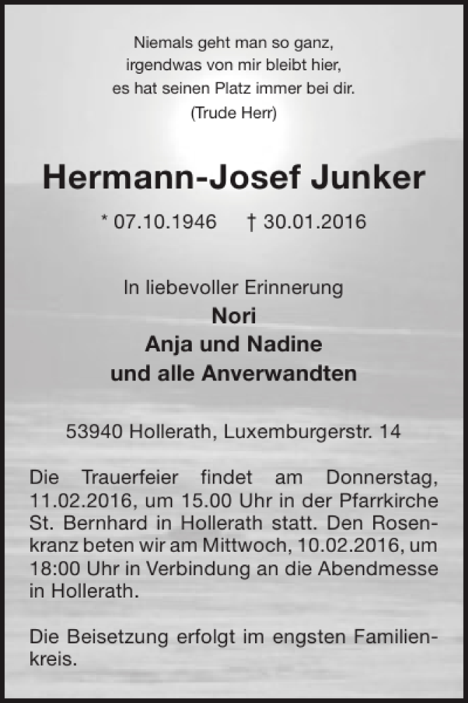 Hier finden Sie alle Traueranzeigen aus der Zeitung, die bisher für Hermann-Josef Junker erschienen sind. Weitere Traueranzeigen, die in der Zeitung erscheinen, werden hier ebenfalls aufgelistet