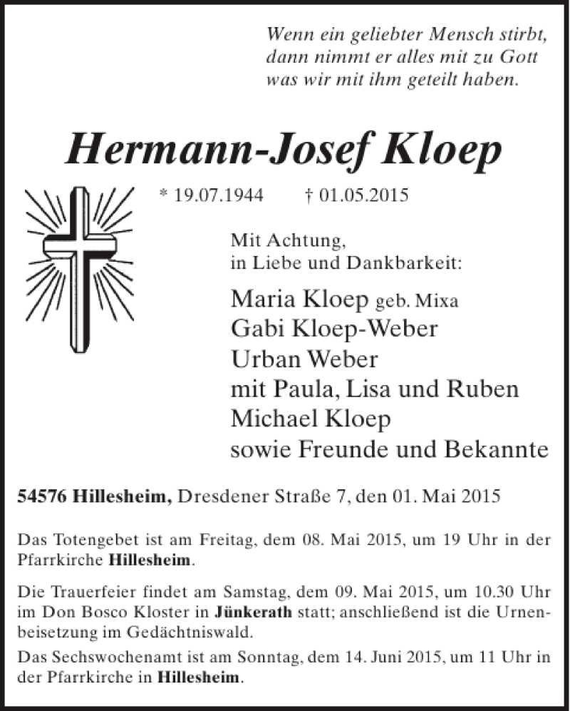 Hier finden Sie alle Traueranzeigen aus der Zeitung, die bisher für Hermann-Josef Kloep erschienen sind. Weitere Traueranzeigen, die in der Zeitung erscheinen, werden hier ebenfalls aufgelistet