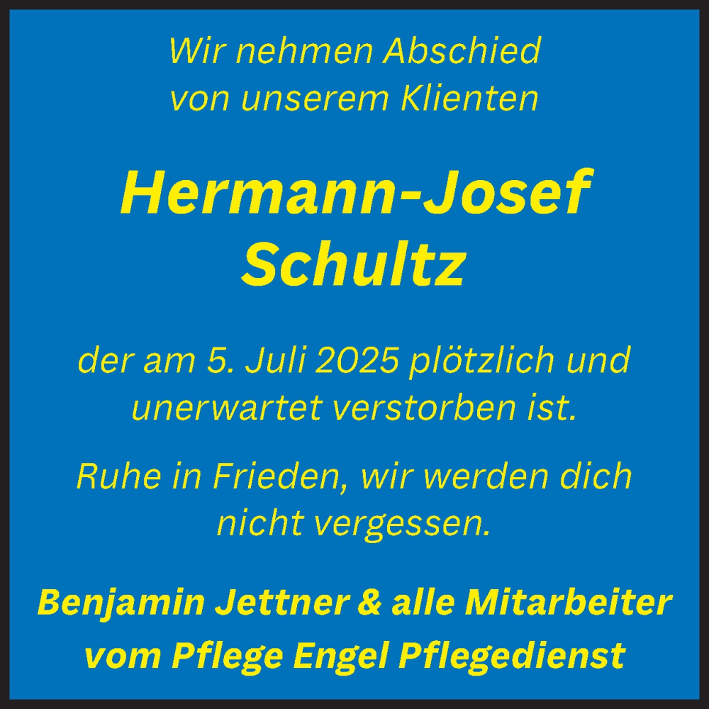 Hier finden Sie alle Traueranzeigen aus der Zeitung, die bisher für Hermann-Josef Schultz erschienen sind. Weitere Traueranzeigen, die in der Zeitung erscheinen, werden hier ebenfalls aufgelistet