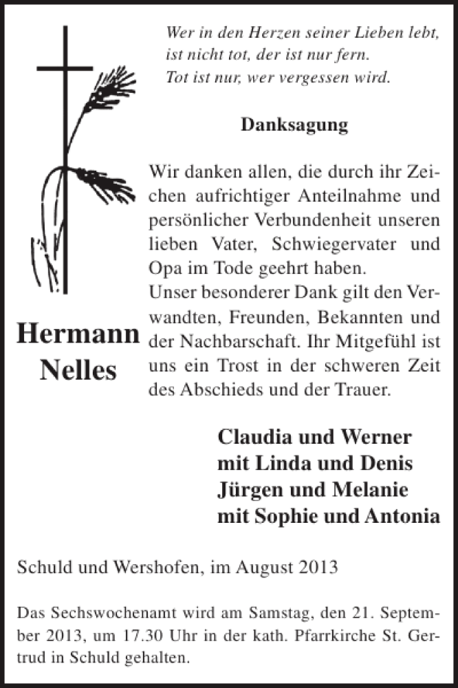 Hier finden Sie alle Traueranzeigen aus der Zeitung, die bisher für Hermann Nelles erschienen sind. Weitere Traueranzeigen, die in der Zeitung erscheinen, werden hier ebenfalls aufgelistet