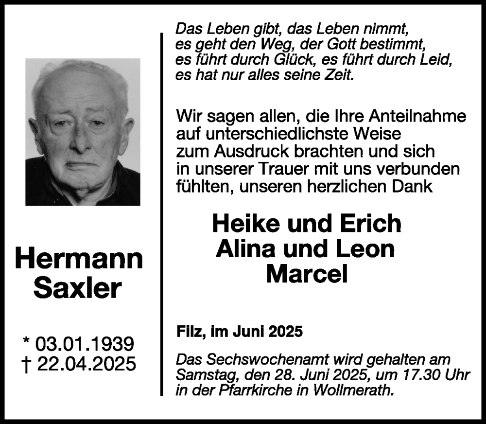 Hier finden Sie alle Traueranzeigen aus der Zeitung, die bisher für Hermann Saxler erschienen sind. Weitere Traueranzeigen, die in der Zeitung erscheinen, werden hier ebenfalls aufgelistet