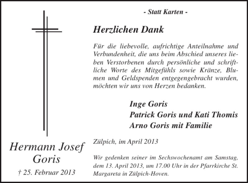Hier finden Sie alle Traueranzeigen aus der Zeitung, die bisher für Hermann Josef Goris erschienen sind. Weitere Traueranzeigen, die in der Zeitung erscheinen, werden hier ebenfalls aufgelistet